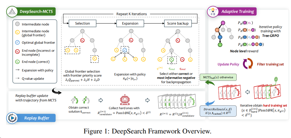 - 蒙特卡洛树搜索(MCTS): DeepSearch 的核心创新在于将 蒙特卡洛树搜索(MCTS)直接集成到 RLVR 训练过程中,而非仅用于推理阶段。这种设计Tree-GRPO使得模型能够在训练时进行系统性探索,并实现细粒度的信用分配(fine-grained credit assignment)到推理的各个步骤。